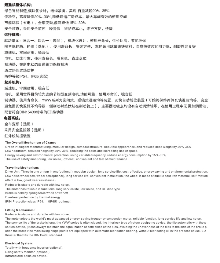低噪音、免維護(降低檢修時間及維護成本低)(因結(jié)構(gòu)簡單,故配套件品種少,后期方便采購,同時也降低了庫存)。我公司的歐標(biāo)起重機通過變頻器調(diào)速,能有效減少用電量20%-30%,降低了使用成本,提高了使用效率。